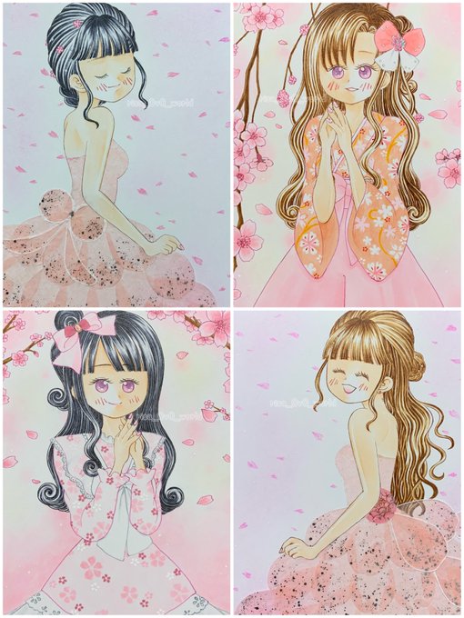 #春のお絵描き大会2023 素敵タグお借りします🙇🏻♀️✨ もう見飽きてると思いますが(^-^; 出来に大満足している桜祭りな4枚で参加させて頂きます(*´罒`*)ニヒヒ♡︎ 右下と左上の作品のドレス部分は桜の花びらの形の紙吹雪を貼って、ラメマニキュアで仕上げております👍🏻✨