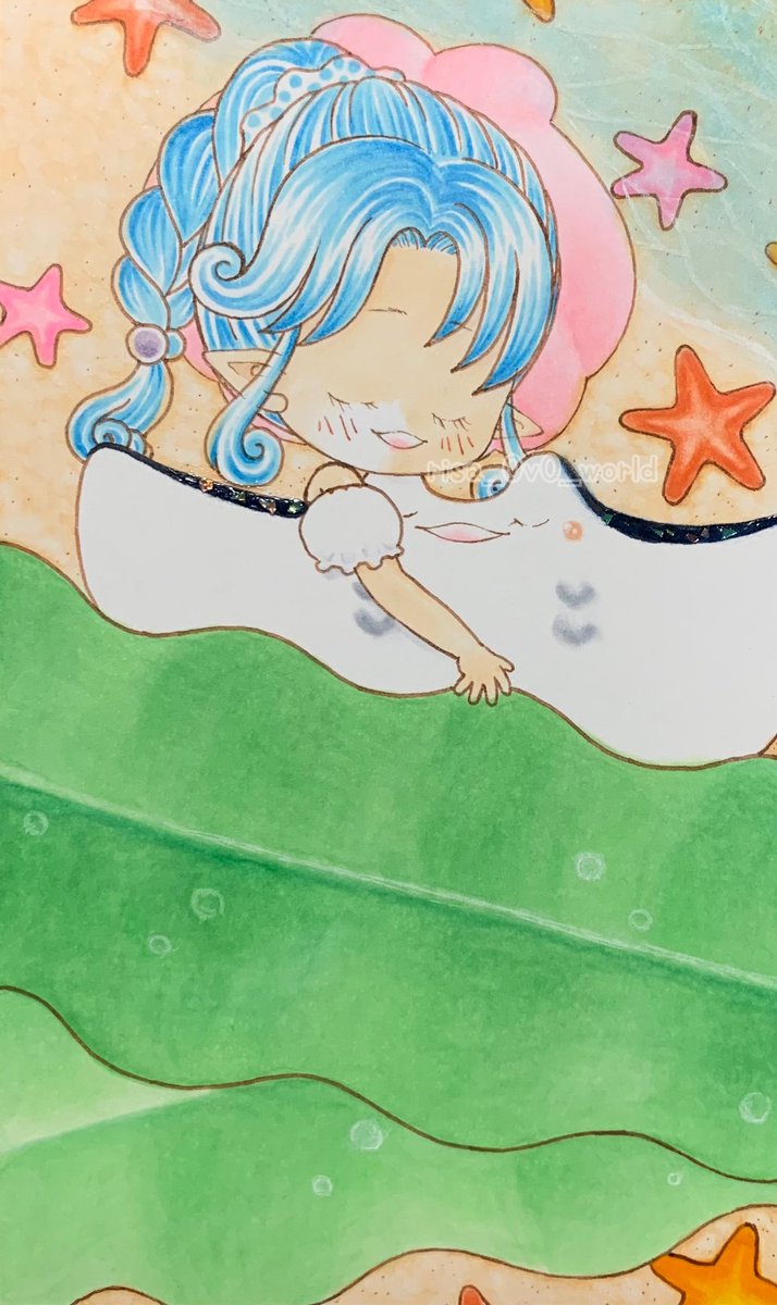 4日目もどうぞよろしくお願いいたします🙏🏻✨ 〜作品紹介〜 さざなみに癒されて 創作キャラの水の妖精ルルが波の音に癒されているところを描いてみました🎨✨ 海の透明感が上手く出せたかなと思ってます(*´罒`*)ニヒヒ♡︎ twitter.com/gallery3150/st…