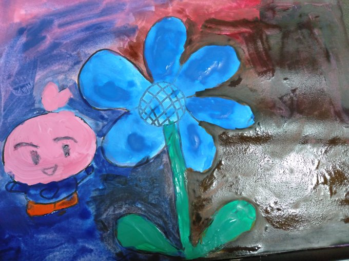 #イラスト #絵の具 #ゆるい 青い花とハートちゃん(≧▽≦)