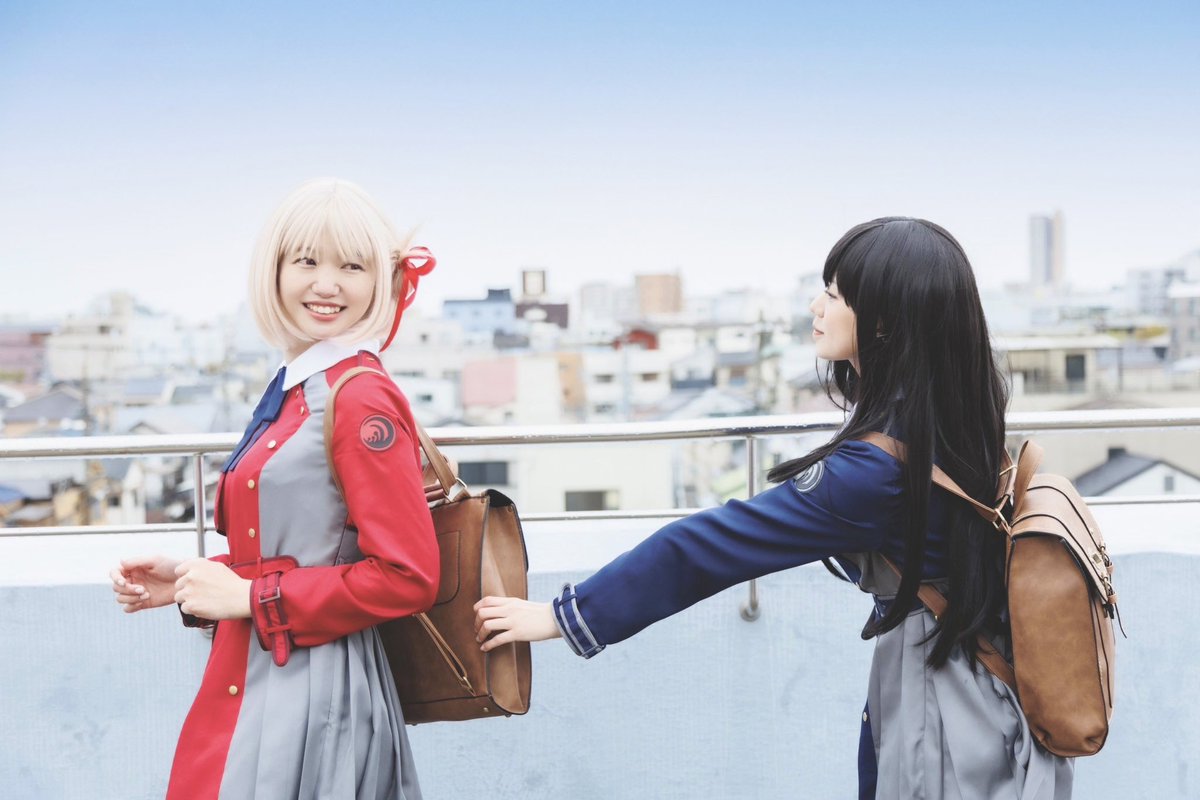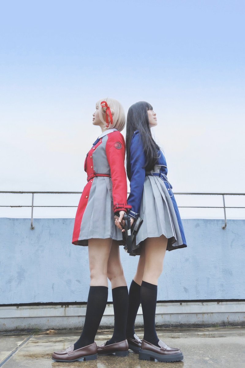 @新長田駅 歩道橋 ❤️さぁ、今日も仕事といきますか! 💙ええ。 錦木千束❤️りっさ 井ノ上たきな💙みぃ(@miiiiiichan333 ) 📸ハヤテさん #コスメルin旧二葉小学校 #コスメル #lycoris_recoil #LycorisRecoil #リコリスリコイル #リコリコ #錦木千束 #井ノ上たきな #コスプレ #cosplay