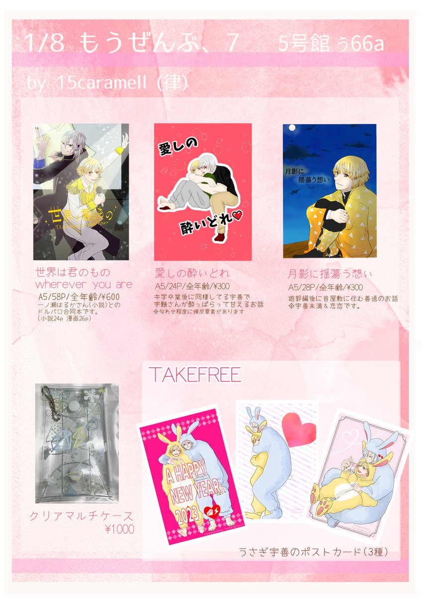 #宇善イベント_サークル参加します 2023/1/8インテ大阪 日輪鬼譚27(もうぜんぶ、7)のお品書きです🍀 双葉さん( @ fuutaabaaakmt )と合同での参加です✨ 新刊はないですが、無配でポストカード用意したので良ければ貰いに来てください☺️ ※別会計にご協力お願いします🙏🏻