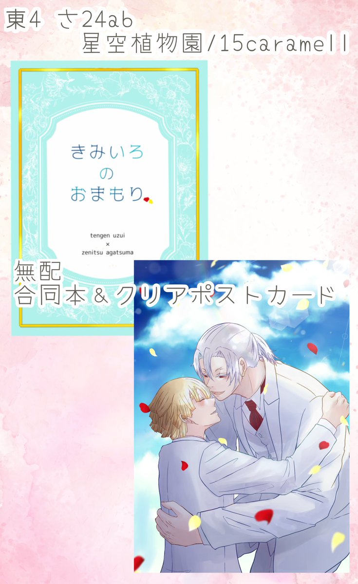 6/25 東4さ24ab 星空植物園/15caramellで置く無配のお知らせです🍀 ①合同本『きみいろのおまもり』 現パロ宇善で、思い出のピアスをテーマに、ふたりのはじまりから結婚、そして十年後までを「双葉(小説)」→「律(漫画)」→「りりこ(小説)」の連作でお届けします。 ②クリアポストカード twitter.com/fuutaabaaakmt/…