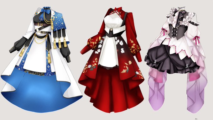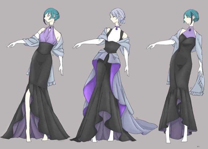 アズール、ジェイド、フロイドのイメージドレス考えてみました🦈🐙🐬 各寮服をベースにデザインしてます #twst夢 #twstファンアート #twstプラス