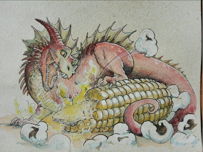 Long before humans started to enjoy puffed up corn as popcorn there were dragons that figure this out. They did not had butter to add though 🐉🔥🌽🍿 (or maybe one bigger dragon shaked a cow enough to make some ? 😏🤔) #inktober #inktober2020 #inkdrawing #dragon