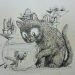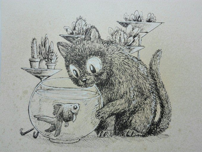 Mr fish had his biases against becoming a friend with this cat, but after she tried licking his tank a few times, waved at the water surface, but too polite to enter, and always interested in him, he admitted it cant be that bad after all #inktober #inktober2020 #inkdrawing