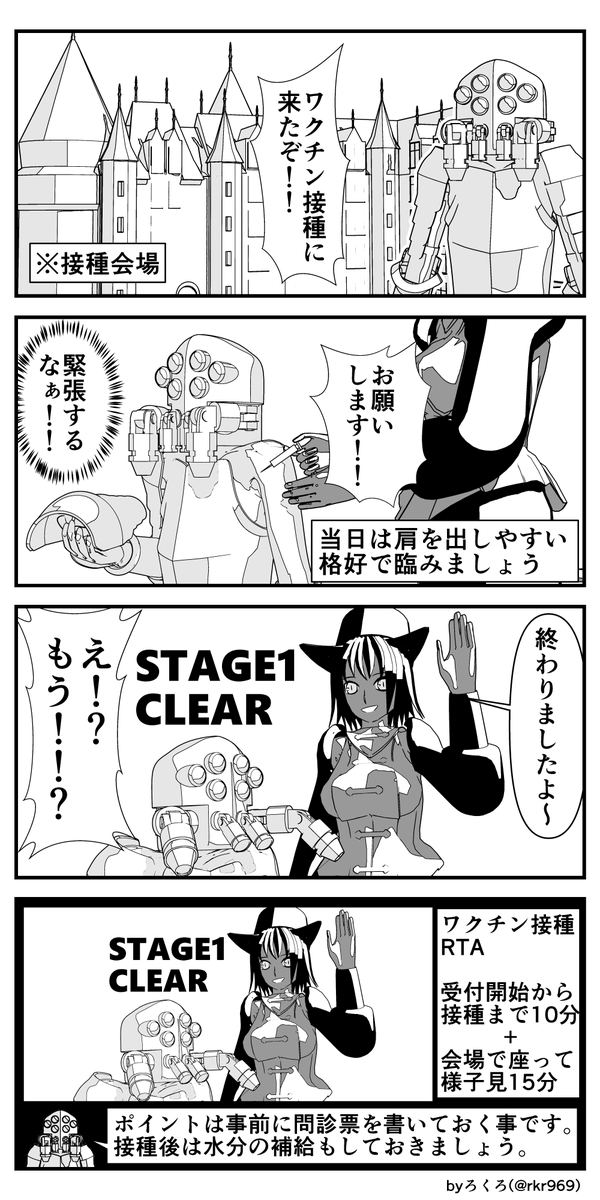 昨日ワクチン接種済んだのでその時思った事を描きました。これから接種する方は事前に水分の補給手段を確保しておいた方が良いと想います。自分の時は会場にペットボトル飲料を持ち込んでいる方を結構見かけました。 #漫画が読めるハッシュタグ