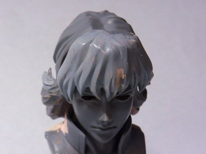 27 85 画集を見ながら前髪の毛束の流れを試行錯誤中。山谷が単調にならないように、陰影が良い感じに出るようにしたい。 持ってたけど使ってなかったサフェーサー1000を形状確認の為に筆塗りしたけど、光沢が出るのは個人的には形が見にくいかも。 23/04/23 19:31