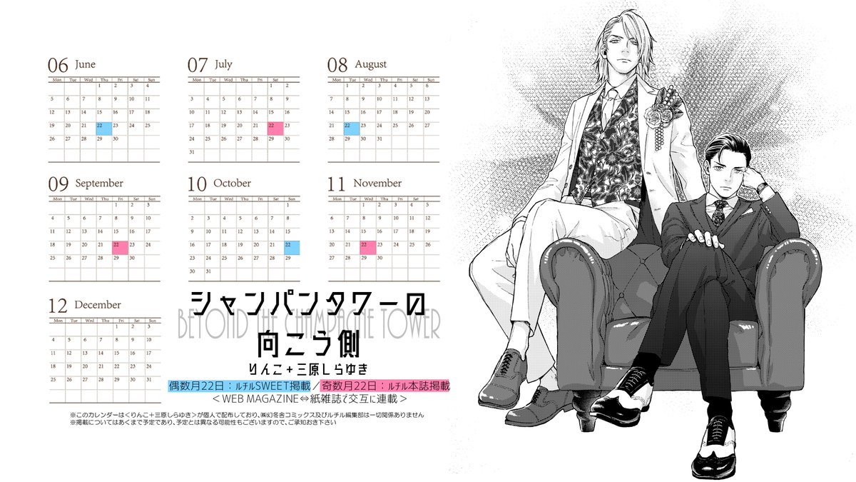 #拡散希望 #商業BL 6月22日(木)配信予定・WEB雑誌「ルチルSWEET」様掲載の「シャンパンタワーの向こう側」第1話、チラ見せです★ 「ルチルSWEET」様は配信から二カ月間は無料で読めるWEB雑誌なので、是非第1話だけでも覗いて頂けると嬉しいです! 4枚目画像はPC壁紙用のカレンダーです★ twitter.com/rnk_0310/statu…