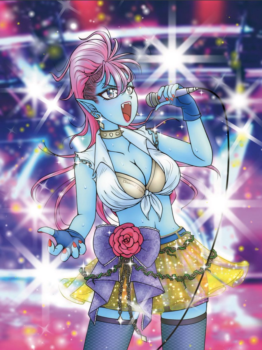 #絵師が本気でトランプを作る企画 ギリギリ完成です🥰 所属:ダイヤモンドティアラ 担当:♦︎6 名前:狂咲 刃薔薇(きょうざき ばーばら) 紹介:悪魔界のスケ番長、何の因果か電脳世界でアイドルに転生!?竹刀をマイクに持ち替えて、力強い歌声で観客を魅了しちゃうんで夜露死苦!!