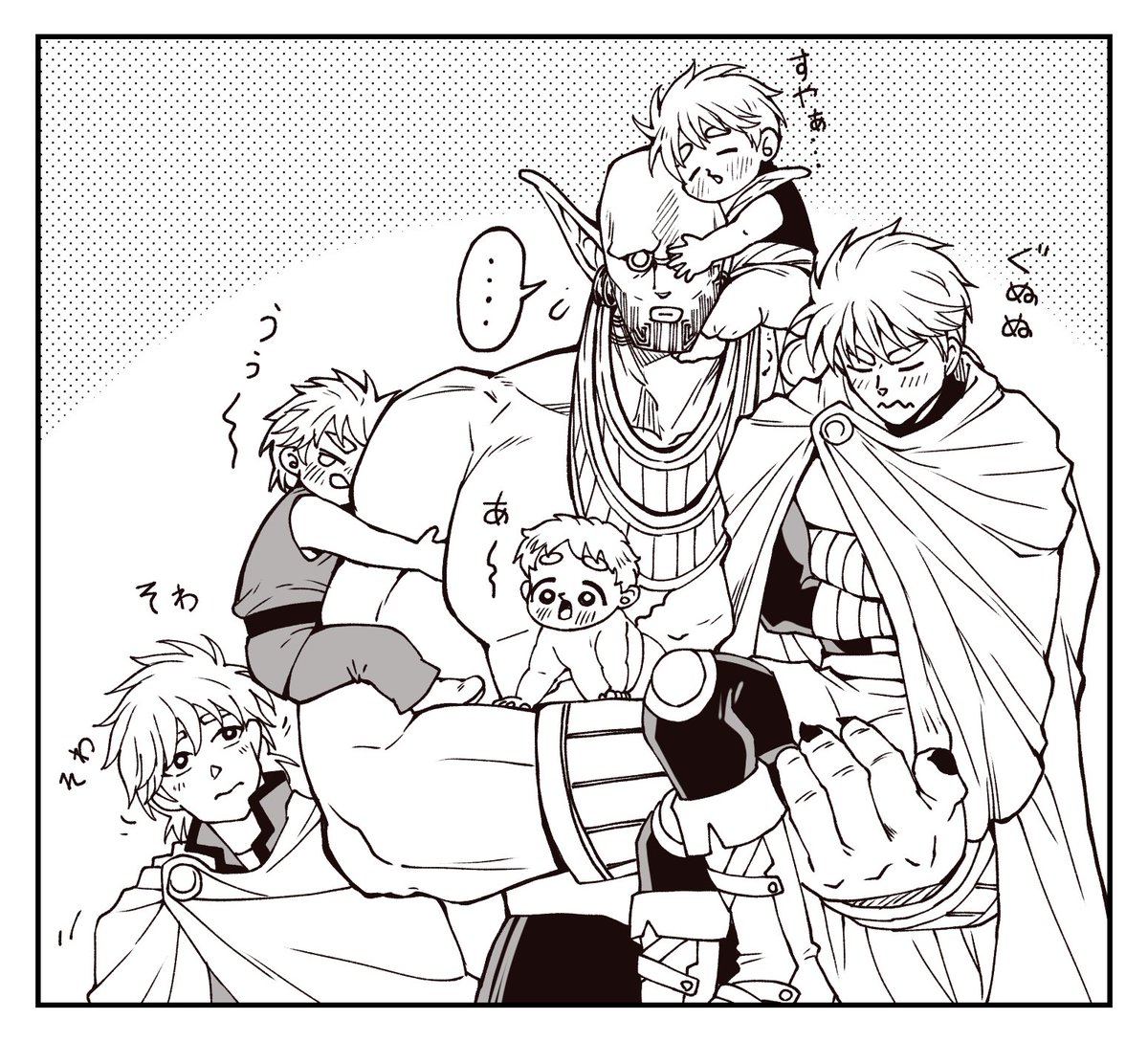 #1番目にリプきたキャラを幼児化させて2番目にリプきたキャラに抱っこさせる 子ガンガの子守りをするzmzくんと、修行で泉に落とされたチビマトを拾ったバーン様