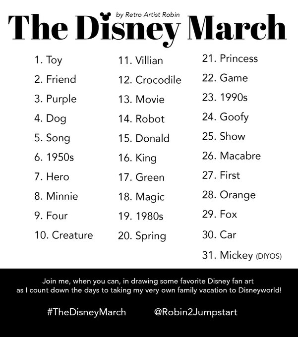 I’m going with my family to Disney World for Spring Break! To countdown the days I decided to do a super fun art challenge. Join me! #TheDisneyMarch #artchallenge #retroartist #disneyfanart #CartoonArt