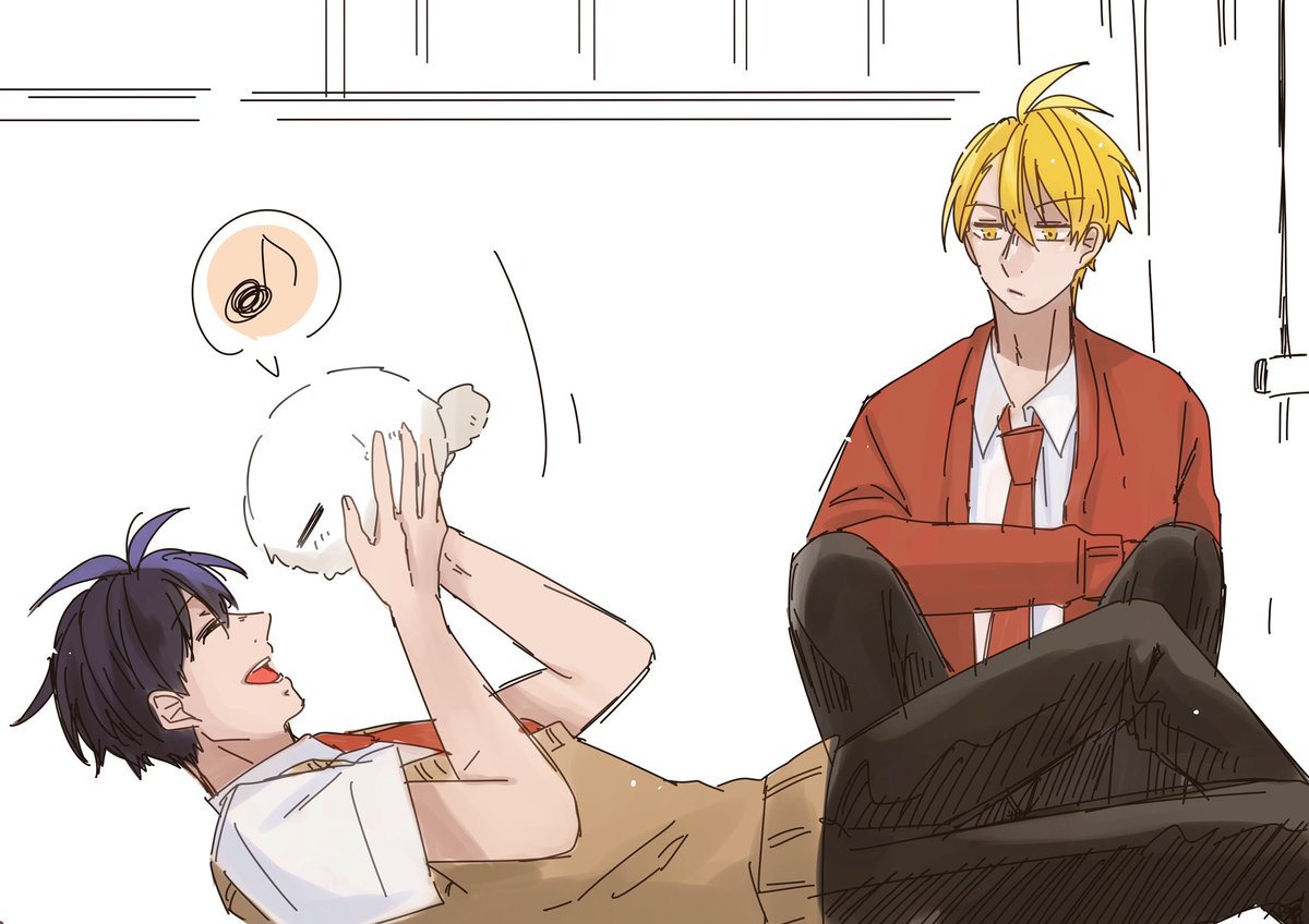 エアスケブ④ モジャと一緒に床でごろごろしているあしやくんを無表情で見るあべのさん #今日も明日もいつまでも2