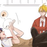 21 87 エアスケブ④ モジャと一緒に床でごろごろしているあしやくんを無表情で見るあべのさん #今日も明日もいつまでも2 21/07/26 23:11
