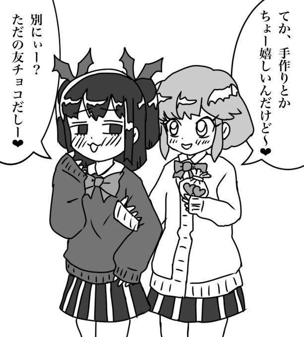 バレンタイン回のぷにる 本気の友チョコを受け取るちーちゃんと友達が良かった。百合ですねこれは。 2人はきっと幼なじみで、多分この後いっしょに下校中、夕暮れの中初チューしたんだと思います。 #ぷにるはかわいいスライム #fanart