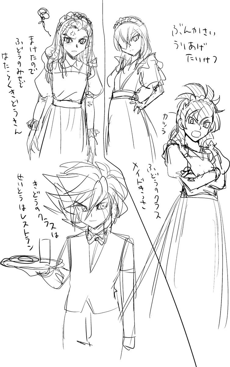 メイドの過去絵これしかない 帝国高等部で文化祭があって、クラスごとに売上げを競うことになって、鬼道さん源田くんのクラスは正統派レストラン、不動くん佐久間のクラスはメイド喫茶。佐久間メイドの美しさのおかげで不動クラスが勝利、負けた鬼道さんがメイドをさせられるというストーリーでした