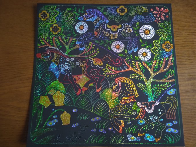 1 24 オオジカオリさんのスクラッチアート『花と動物たちのファンタジー 十二支編』より「午」完成しました~✨ 自分の干支😊 カラフルで楽しかった♪ #スクラッチアート 22/10/30 11:40