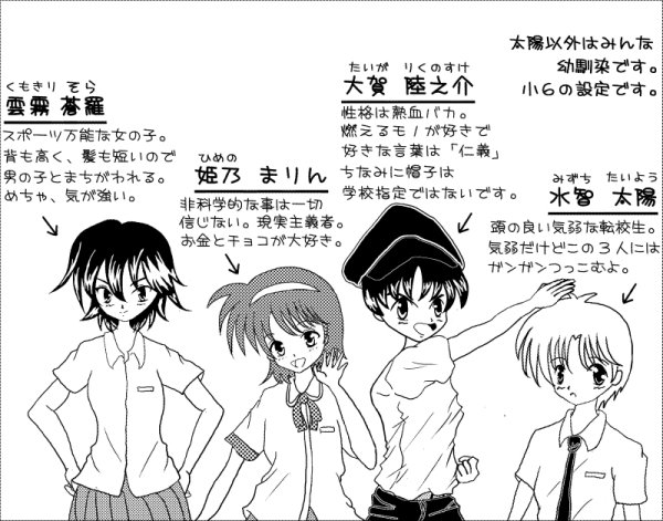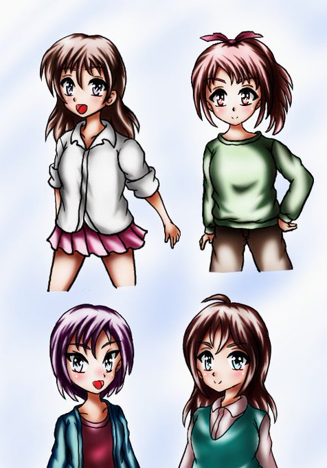 おぉぉーっ!フォロワーさんが2300人越えてましたーっ!ありがとうございますっ!たくさんの方々のイラスト観れて幸せですっ!今日は「りまそたっ♪」の漫画を描く前に描いた4人の初期設定です。今観るとだいぶ設定が変わってます(笑)創拡 #過去絵 #絵描きさんと繋がりたい