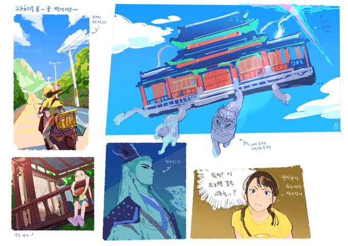 전에 꿨던 하늘에서 궁 떨어지는꿈 잊기전에 후다닥 스케치했다 자세한 내용은 나중에 포스타입에 업로드할때 같이 써서 올려야지 twitter.com/rok0813/status…