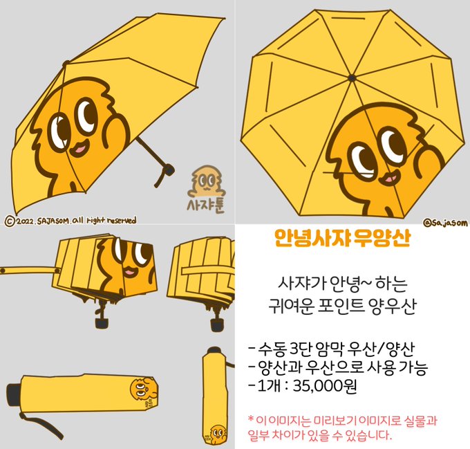 [RT이벤트] 뜨거운 태양과 장마에 대비해 빙글뱅글 사쟈와 안녕사쟈 우양산/양우산을 제작합니다! 종류당 30개 한정으로 시범 제작될 예정입니다. 안쪽은 암막처리 되어 있으며 가격은 1개 35,000원 입니다. 매진시 알티해주시는 분께 원하시는 우산 하나를 드려요! naver.me/5mriHk9I
