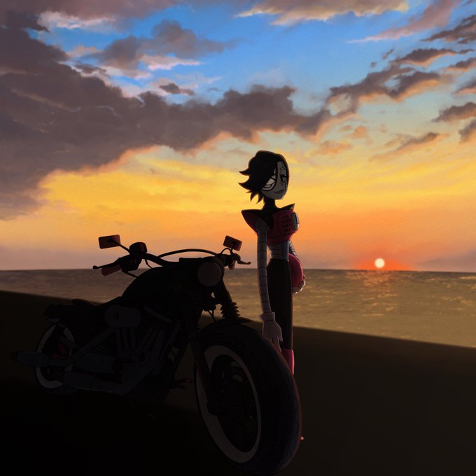 #今までで作画カロリーMAXの作品上げようぜ 1枚目で頑張ってバイク描いたのにほぼ黒塗りになってしまったので2枚目描いたというバイクの日のイラスト