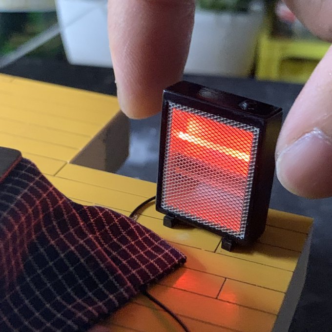 #展覧会が近いので小ネタを紹介する こびとの秘密基地という作品の電子レンジの中には、昨晩の食べ残しの煮物が入っています。 食べ物を作るのはこれが初めてで、凄い頑張って作ったのですが完成したらあんまり見えなくなってて笑っちゃいました 笑 でもこのチラ見え具合がまた好きなんですよね。