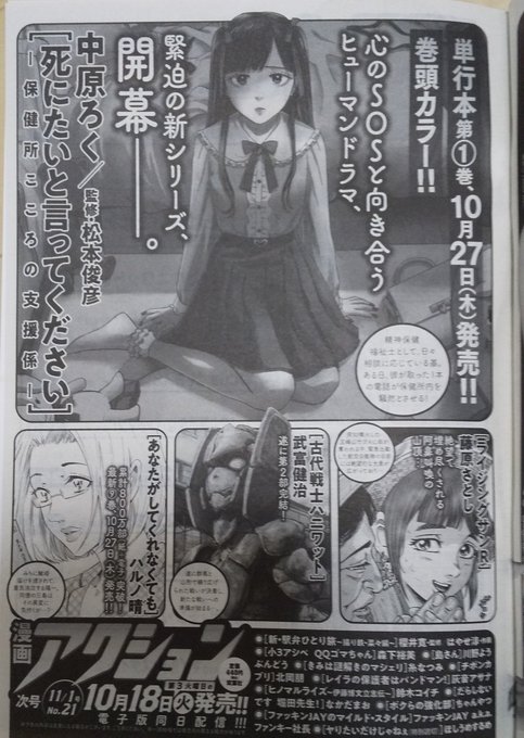 本日発売の漫画アクションに「死にたいと言ってください―保健所こころの支援係―」第11回が掲載されてます。 新章スタートになります! 4月発売の単行本第2巻の予約も始まってます!よろしくお願いしますー! amzn.asia/d/1K4HNHk #しにいつ #漫画アクション