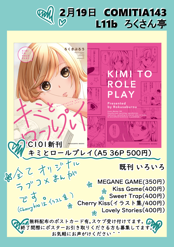 2月19日コミティア143 L11b ろくさん亭です。 夏コミで出した新刊がコミティア初頒布になります。ポスターはこちらの表紙絵になります。終了間際にお引き取り下さる方もゆるっと募集してますのでお声がけください。スケブも受け付けてます。 よろしくお願いいたします! #コミティア #COMITIA143