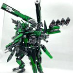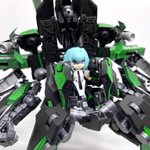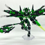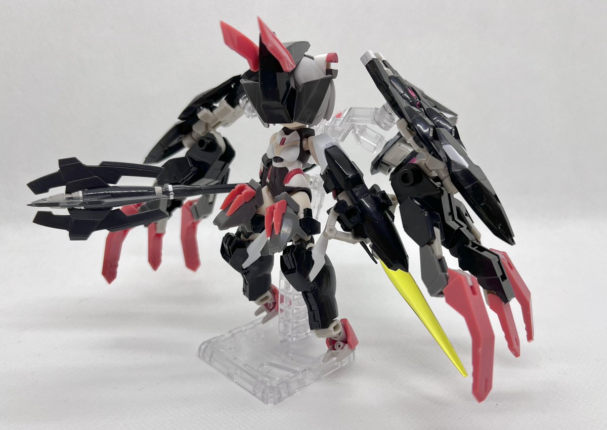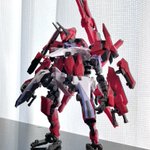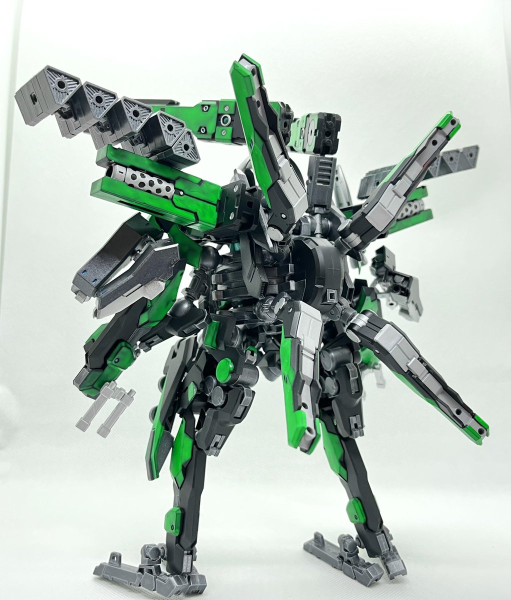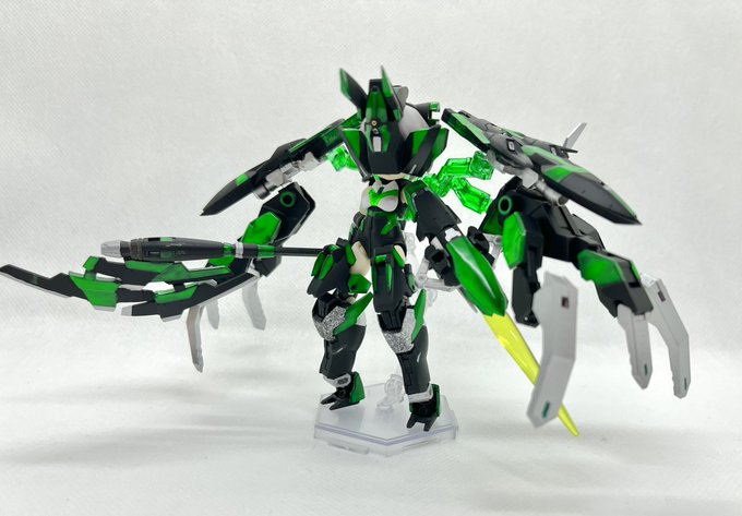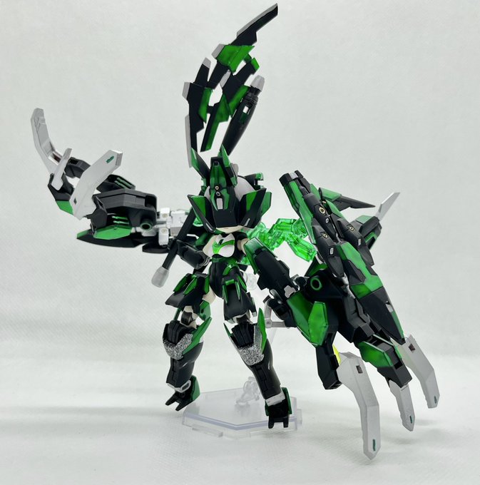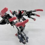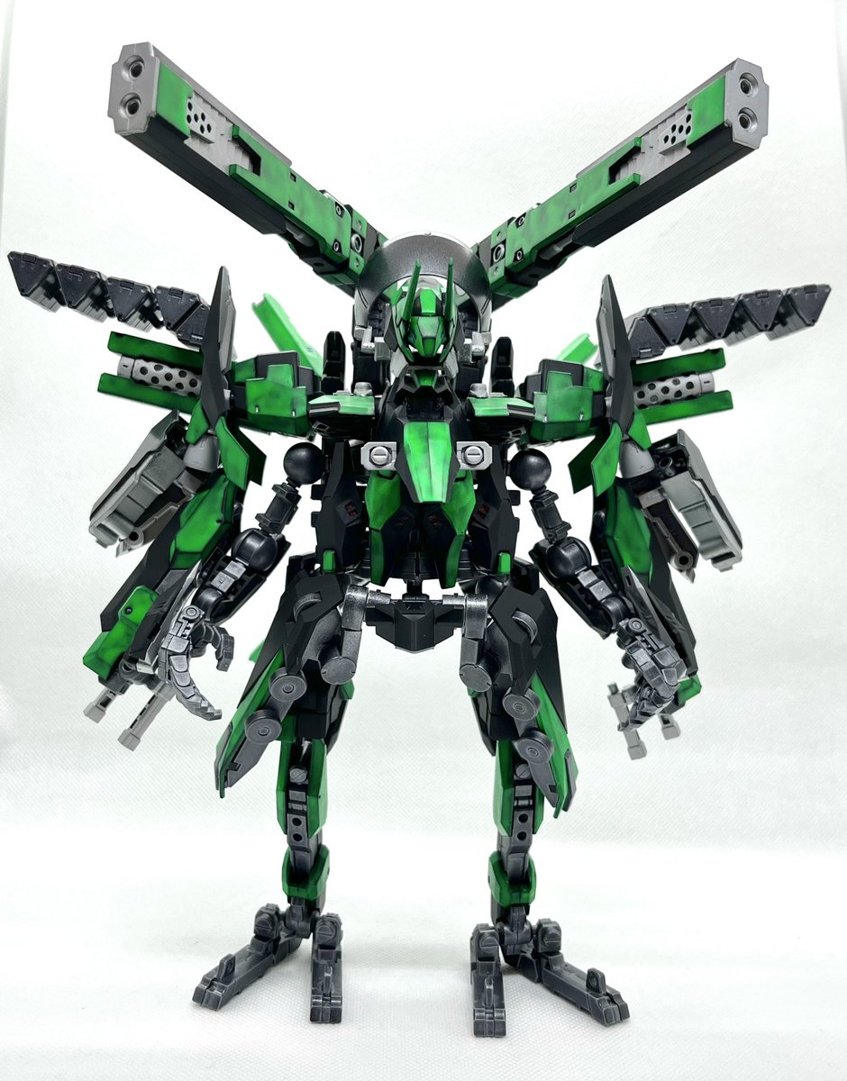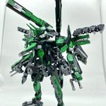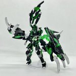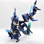 Twitterコンテストは戦闘部門にこれでいこうと思います。グリンブルスティのパーツのみでのカスタムで、鬼の様な見た目のヘッドパーツ、両肩に翼の様に可動する手、ブレードやハンマーや脚部アーマーはそのままですがだいぶ戦闘力の高そうな機体になりました。あと塗装です、、 #デスクトップアーミー