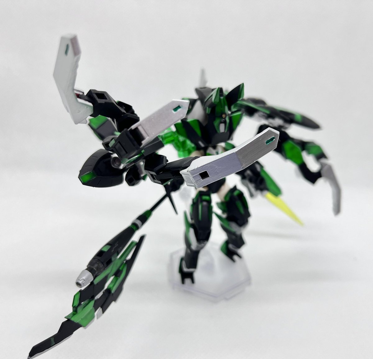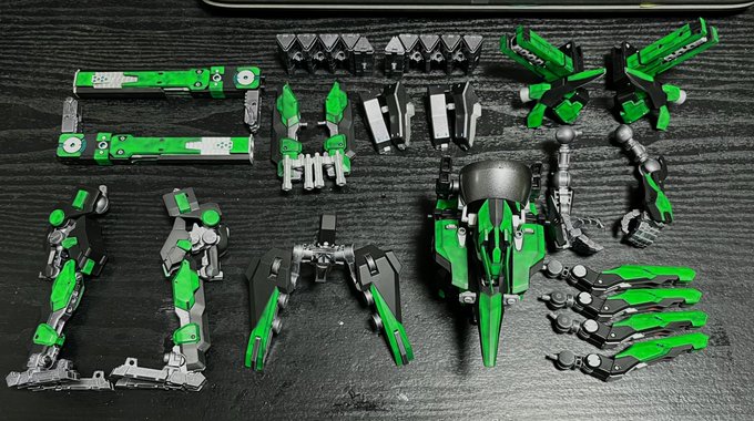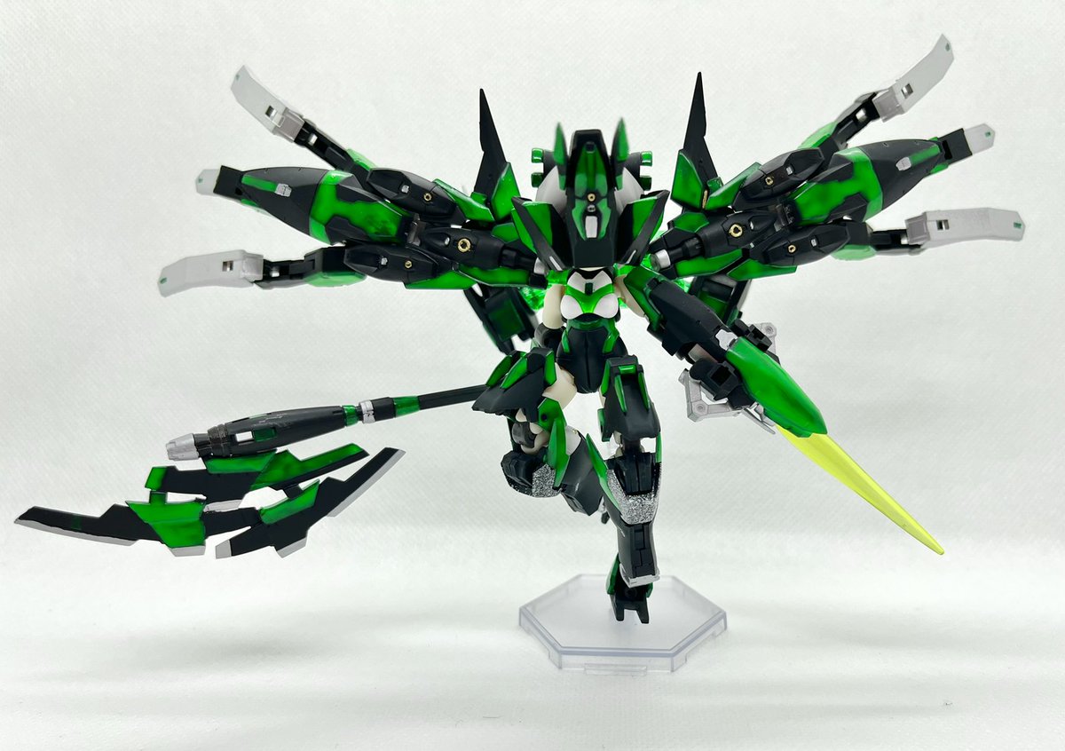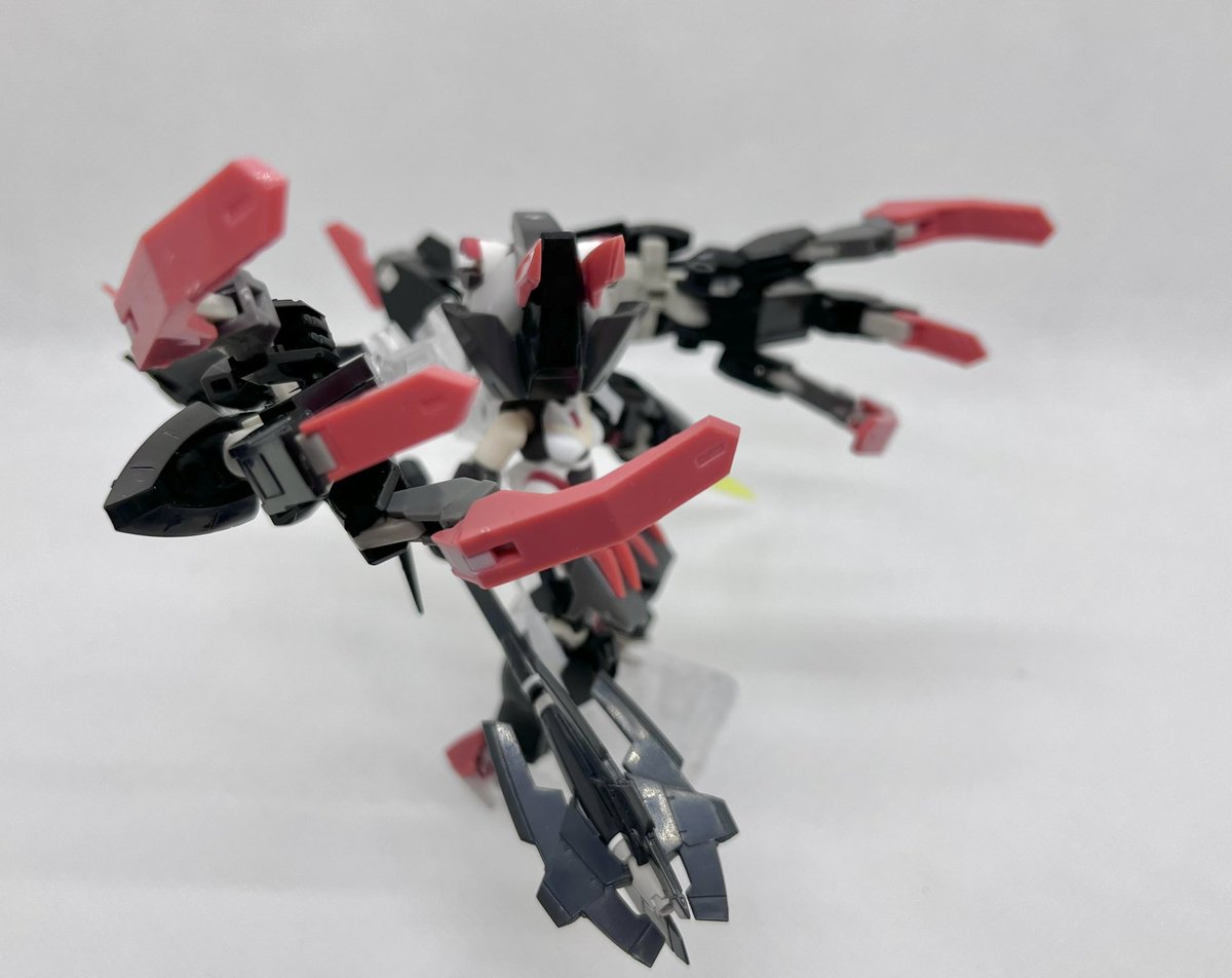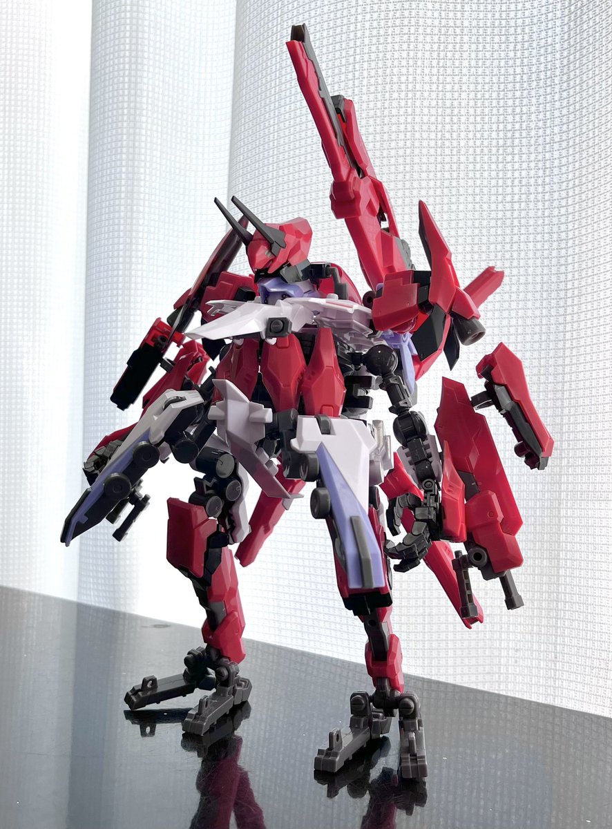 Twitterコンテストは戦闘部門にこれでいこうと思います。グリンブルスティのパーツのみでのカスタムで、鬼の様な見た目のヘッドパーツ、両肩に翼の様に可動する手、ブレードやハンマーや脚部アーマーはそのままですがだいぶ戦闘力の高そうな機体になりました。あと塗装です、、 #デスクトップアーミー