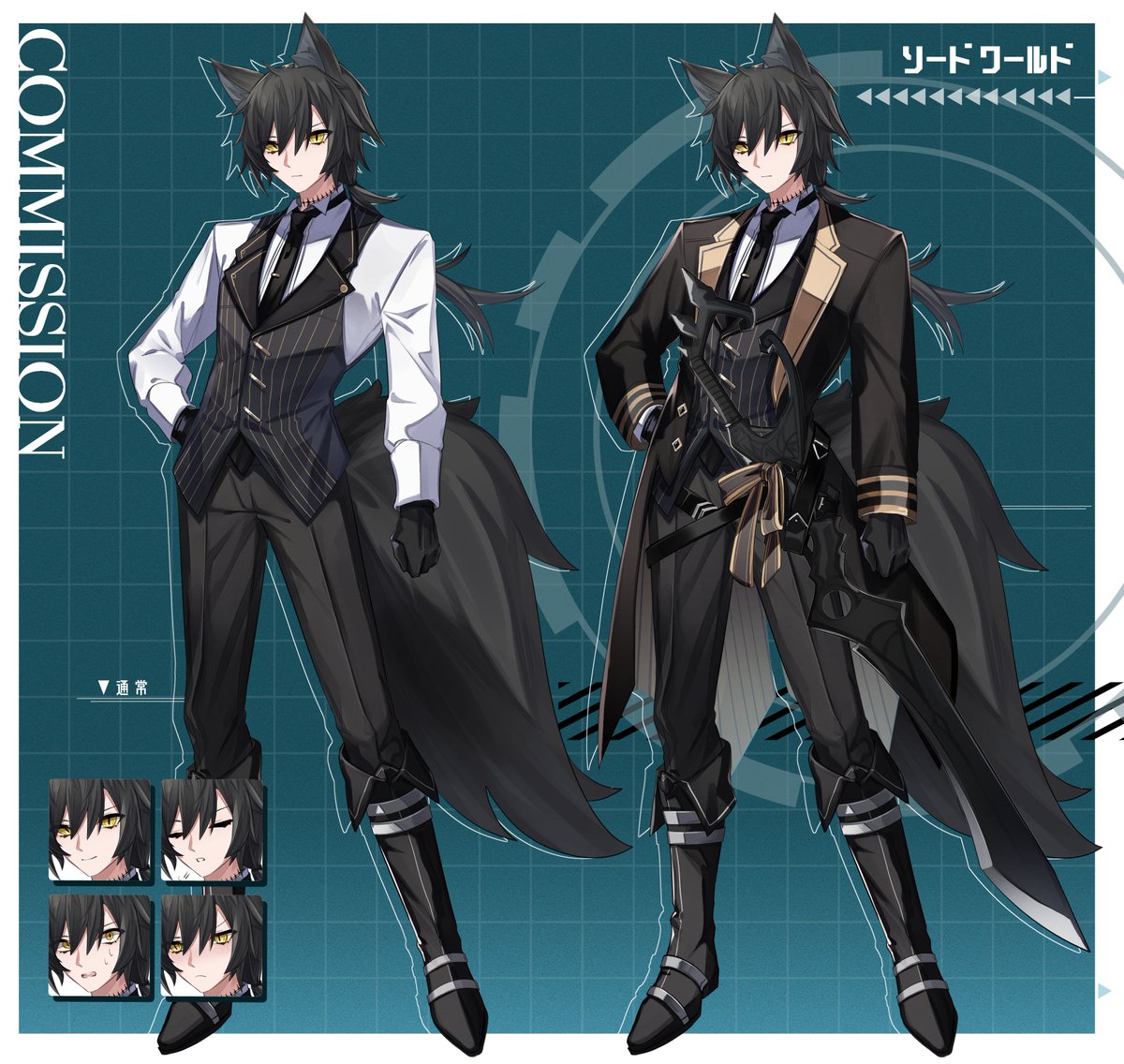 【コミッション】 以前立ち絵依頼をいただいて描いたソードワールド2.5の子です。 立ち耳の執事さんとのことで、ジャケットオンオフ、武器装備差分などたくさん描かせていただきました。