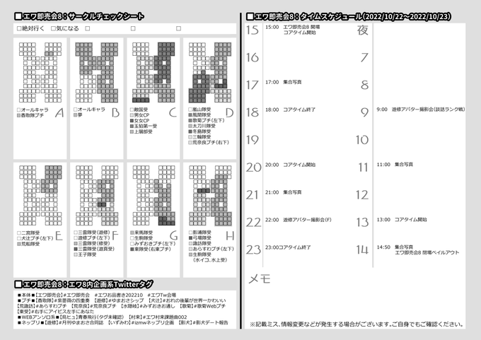 このままだと欲しい物を取りこぼしまくる未来しか見えなかったので(サークル総数的に)自分用にエワ8のサークルチェックシート作りました。 行きたいとこ赤とか青で色分けして塗るタイプです。 ■ネップる(ファmm・ロ-sn・ポpr)A43 CN9 7E9C ■自家刷り用xgf.nu/BpCA 白黒A4推奨かな?
