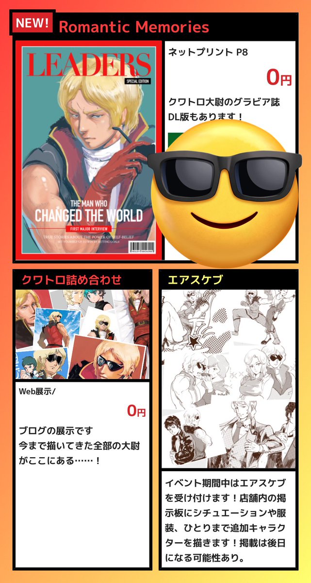 おしながきでございます! イベント期間中のみエアスケブを受け付けています。会場内の掲示板にリクエストを書き込んでくださいね😎 大尉単体または大尉+ひとりまで可(CP要素ありも可)(左右非固定) サンプルにあるような短時間で描ける簡素な絵になります。よろしくお願いします🕶️❤️