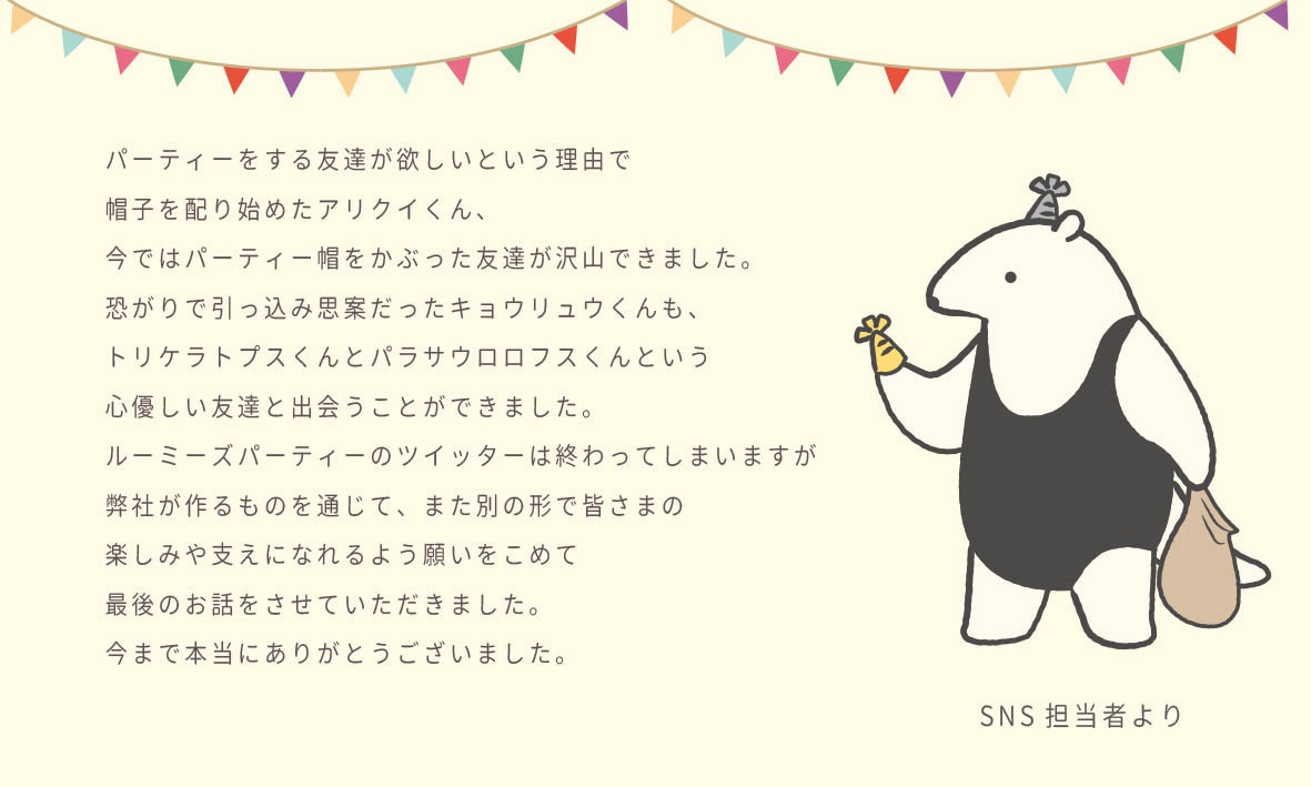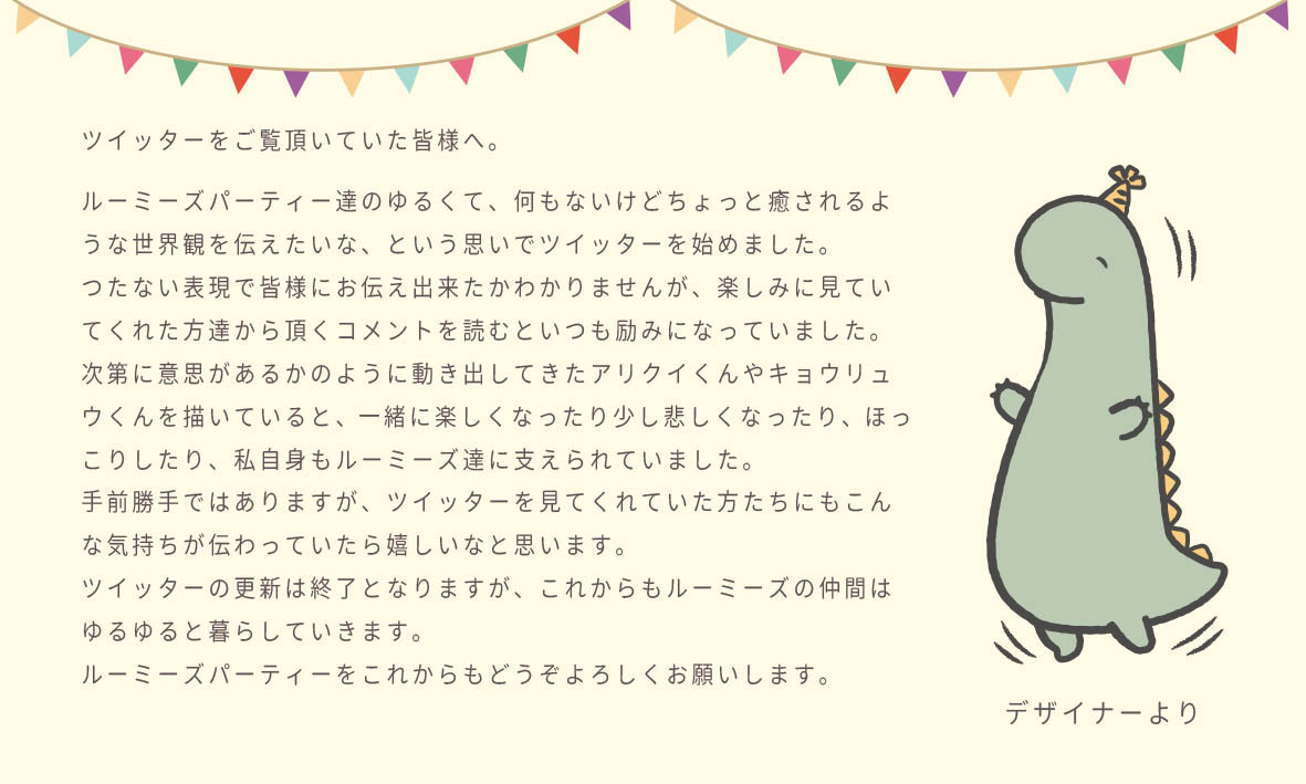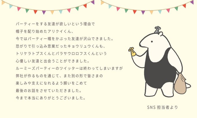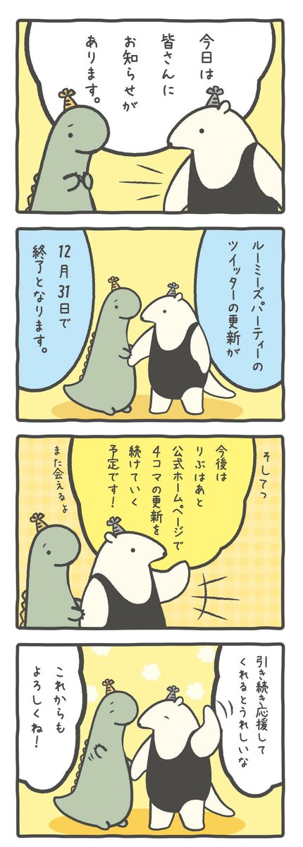 【ツイッター休止のお知らせ】 ルーミーズパーティーのツイッター更新を年内をもって休止させて頂きます。 来年より、りぶはあと公式HPにて隔月で4コマを更新していく予定です❕ 今後ともどうぞよろしくお願いします✨ #ルーミーズパーティー #ルーミーズ #4コマ