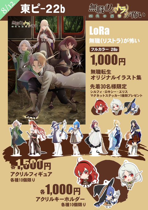 34 144 夏コミのお品書きです。 イラスト集を購入していただいた先着30名様にお好きなマグネットステッカーを1枚付けます。但しハンドメイドなのでクオリティは良くないです。 #C102 #無職転生 #お品書き 23/08/01 18:22