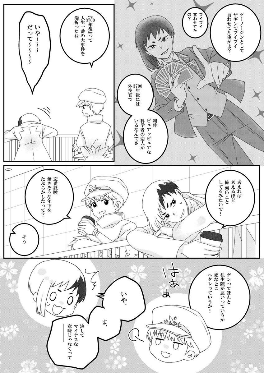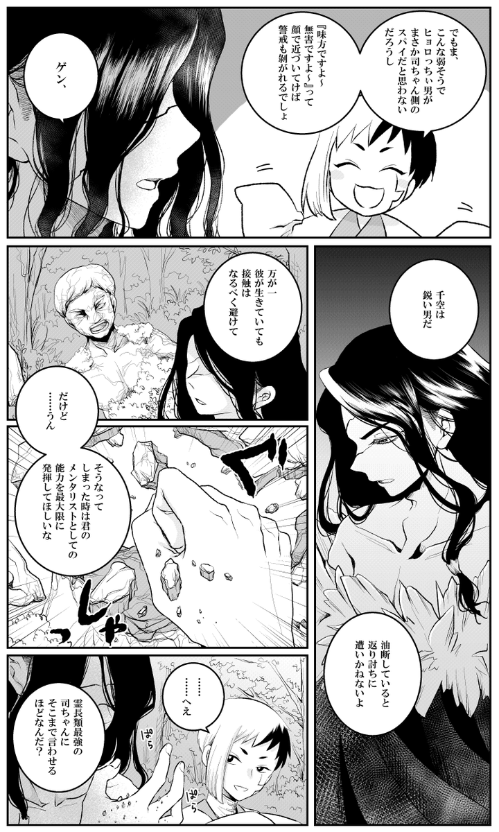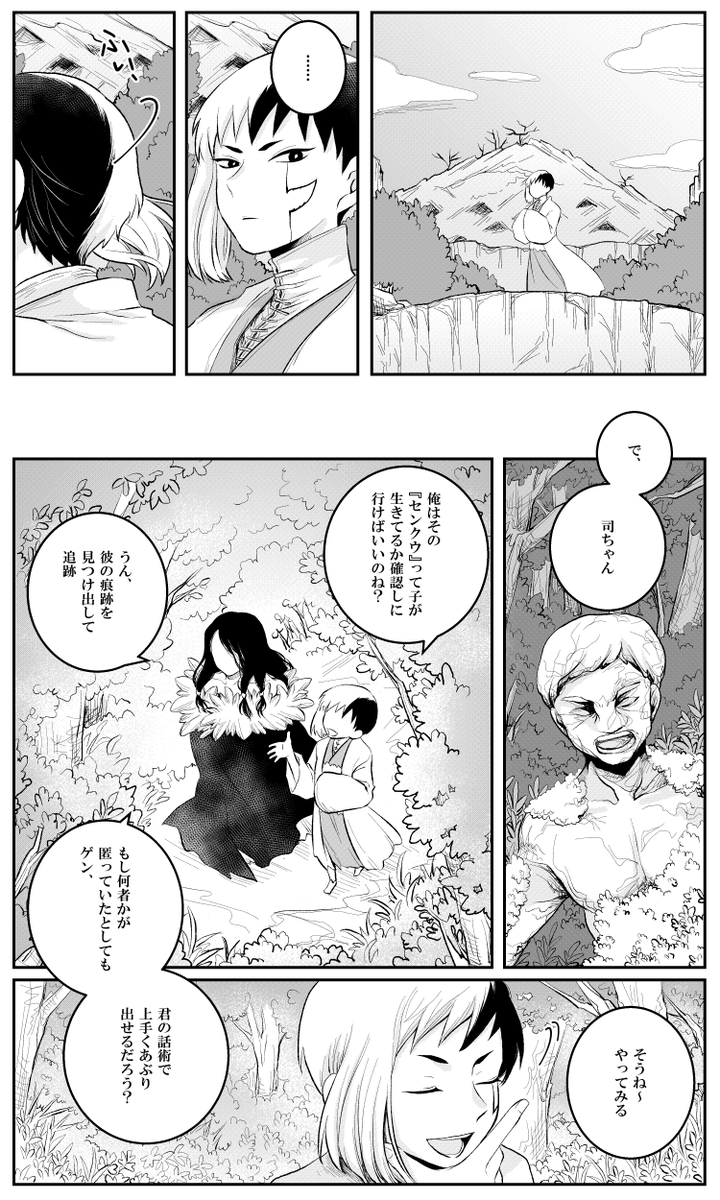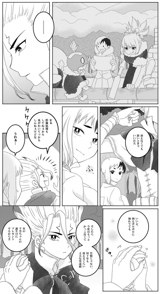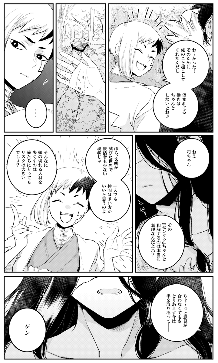 #2022年自分が選ぶ今年上半期の4枚 一枚絵が少ないので、好きなコマ4枚! ①センクゥの手袋、実はタッチパネル対応のやつなんです、というこだわり ②リュースイのすそが上手く描けたかなと ③手が良い感じに描けた ④良い雄ゲかなって思いまして
