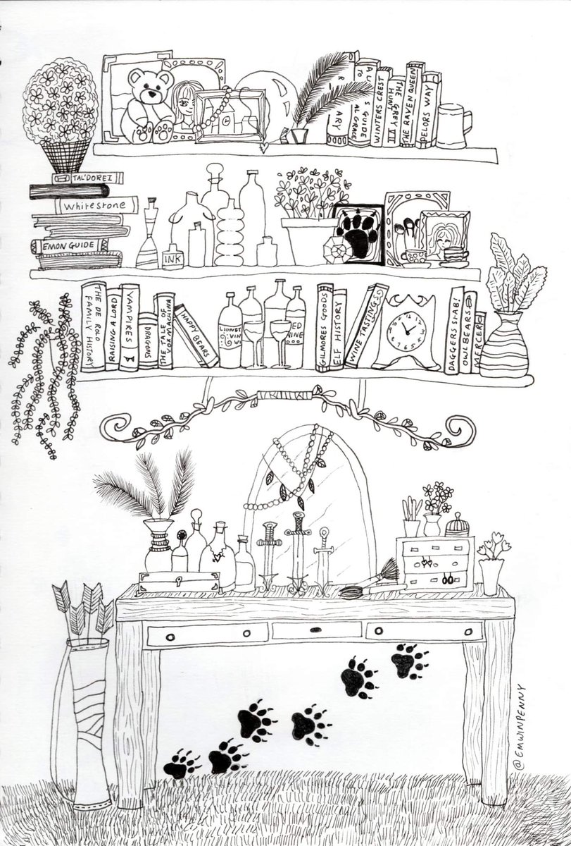 #Vexahlias dressing table and the shelves behind it. How many of the #Criticalrole references can you spot! 😂 . #CriticalRoleArt #tLoVM #illustration #illustrationart