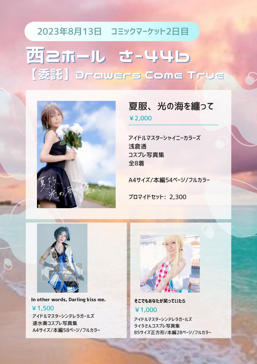 20 42 コミケ2日目はにゅまさんのブースにて売り子、委託させて頂きます✨ 西2ホール さ-44b Drawers Come True 既刊本のみ、数冊の持ち込みなので希望の方はDM頂けたらお取り置きします😌 奏ちゃん、浅倉透、ライラさんのコスプレ写真集です🫶🏻 原神ファルザン先輩のコスプレでお待ちしております🍃 23/08/10 22:00