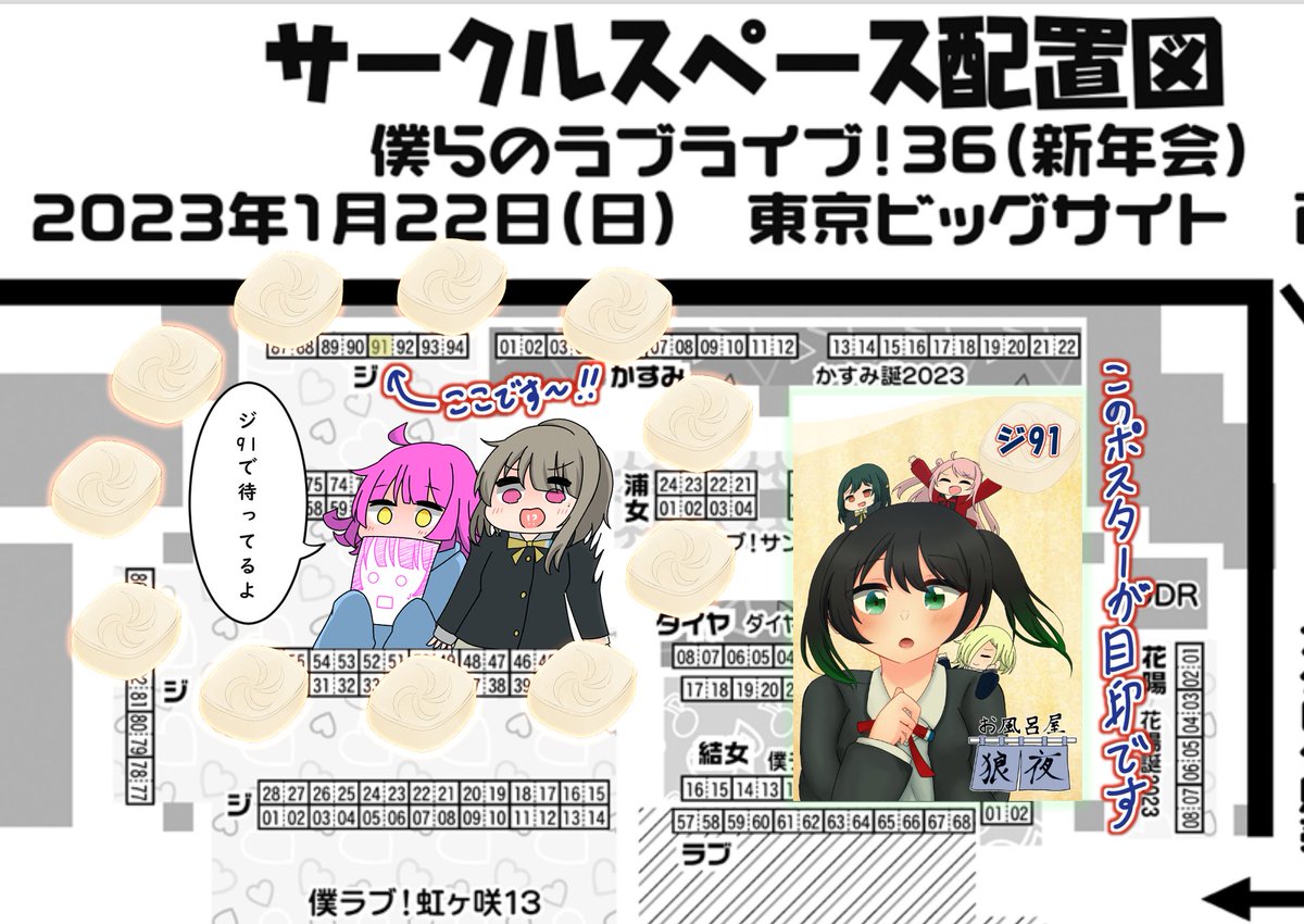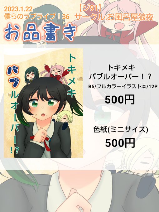 17 36 明日の僕ラブ36のお品書きです! 【ジ 91】サークル『お風呂屋狼夜』でニジガクちゃん×入浴剤の紹介のフルカラーイラスト本販売します〜! 色紙は完成し次第Twitterにあげる予定です! ぜひ遊びに来てください😊 #僕ラブ36 23/01/21 22:30