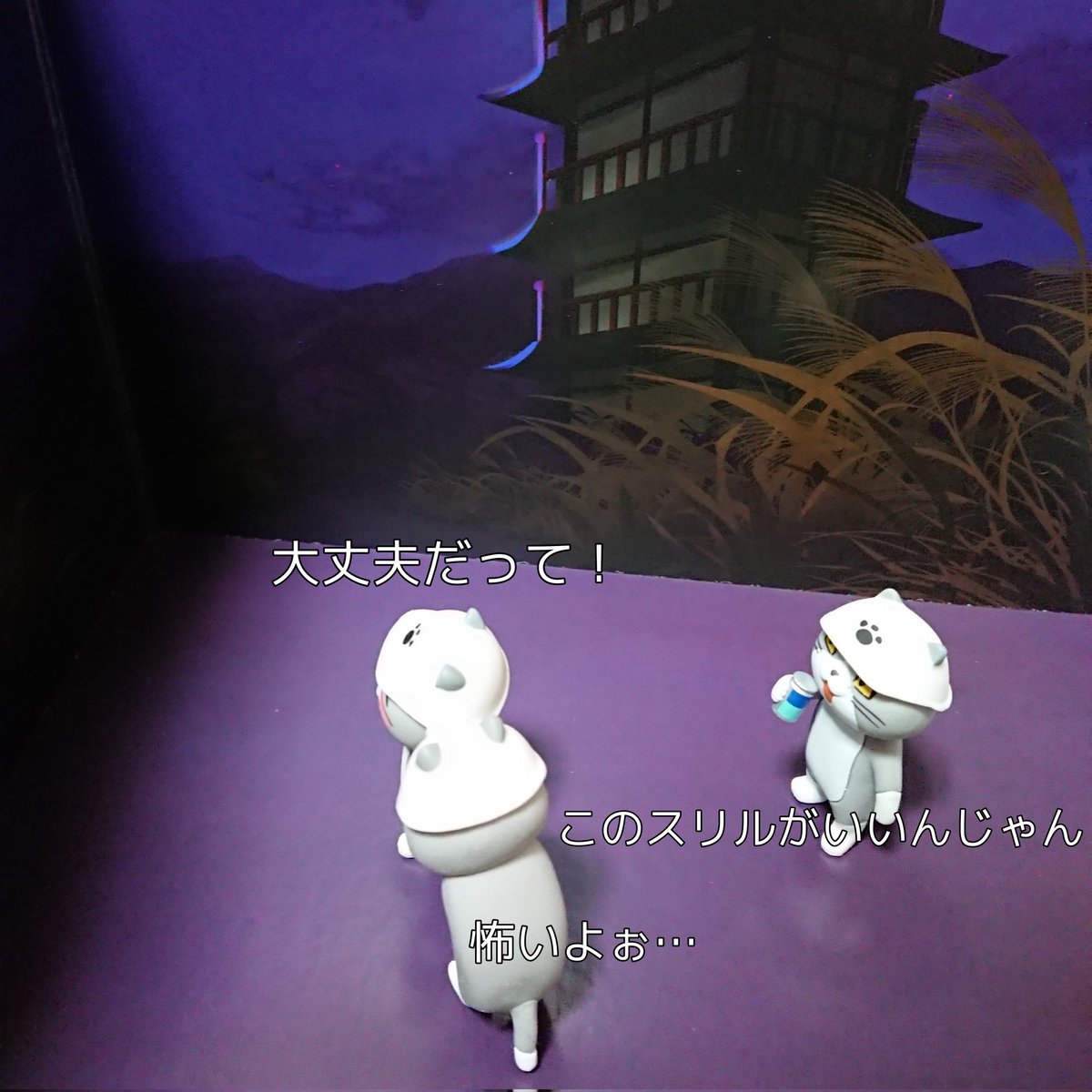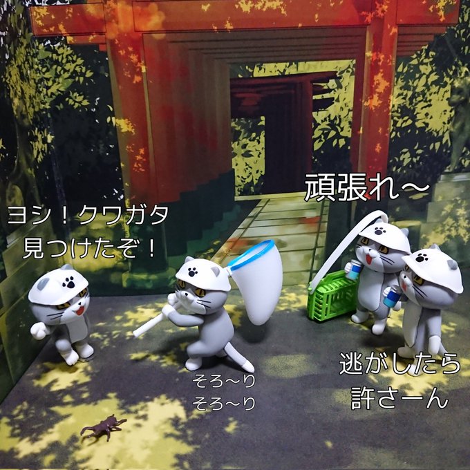 いざ虫取り! 真ん中の網を持ってる猫は仕事猫フィギュア4の看板を持ってる猫です!!こんな使い方もできます!! #トイズキャビン #オモ写 #仕事猫 #黒猫キャンペーン6