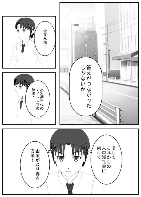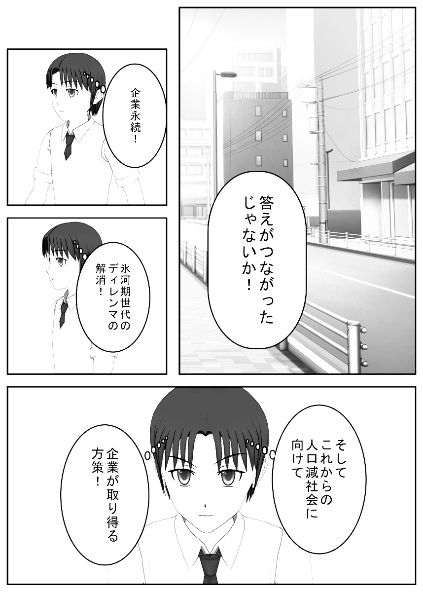 既に何度か書いていますが、企業永続、氷河期世代のディレンマ、これからの人口減社会に向けて企業が取り得る方策について、いまを作っています。 こちらはモノクロのページになっていますが、Amazon Kindle で公開するときはカラーになる予定です。 #漫画が読めるハッシュタグ