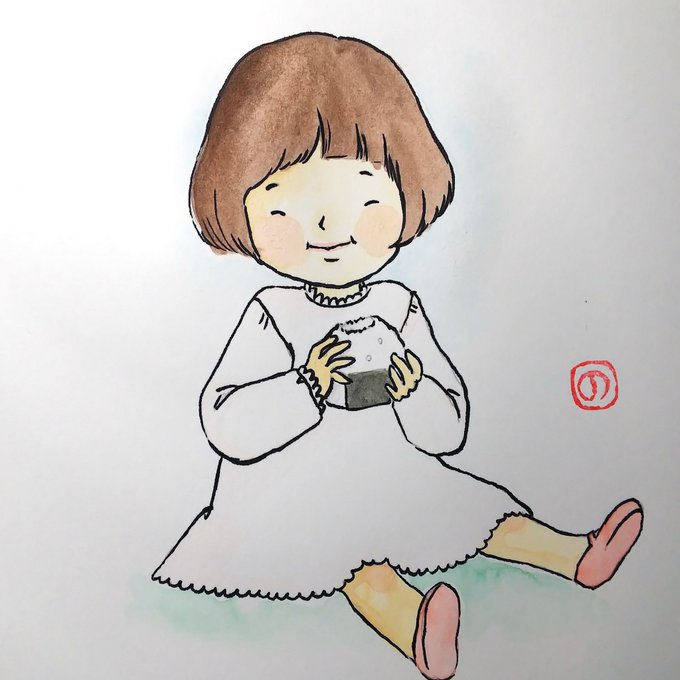 遠足の季節なので、おにぎり食べてみました。でっかいおにぎり! #ふんわりボブ #遠足の季節 #お別れ遠足 #年度末だなぁ #おいしく食べてね #アナログイラスト #筆ペンイラスト #顔彩