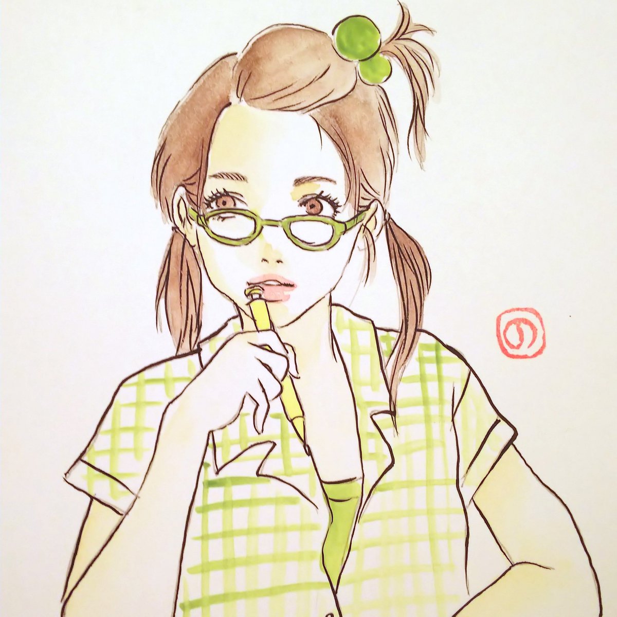 こういう気を抜いてる髪型結構すき。 #今日は #緑な人 #ツインテール #気を抜いてる #アナログイラスト #筆ペンイラスト #顔彩