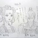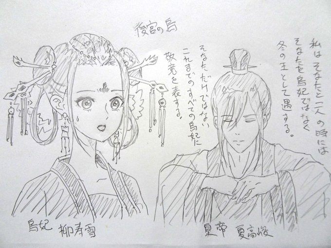 4話)器用な皇帝の助けもあって、無事にヒバリの幽鬼を楽土へ送ることができた烏妃。二人の仲もちょっと近づいたようだ。しかしまた皇太后が原因の案件だったな、次の事件もか、不憫な皇帝だな。 #kokyu_anime #後宮の鳥 #落書き
