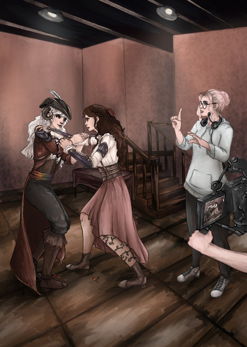 One of my favorite pieces i did for the @filmingdsmp charity zine! Stunt women hannah au, as she teaches Puffy a fight and Niki is stand in director! - #hannahxxrosefanart #nikifanart #captainpuffyfanart #dsmpfanart
