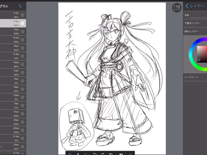 6 61 落書きで適当に描いてたけど、なんか妙にイイキャラになって来たので、もうチョットだけデザイン詰めてみましたw 葛城坐一言主大神フルバーストモードのラフ♪(ちっこいのが通常時 22/03/28 23:35