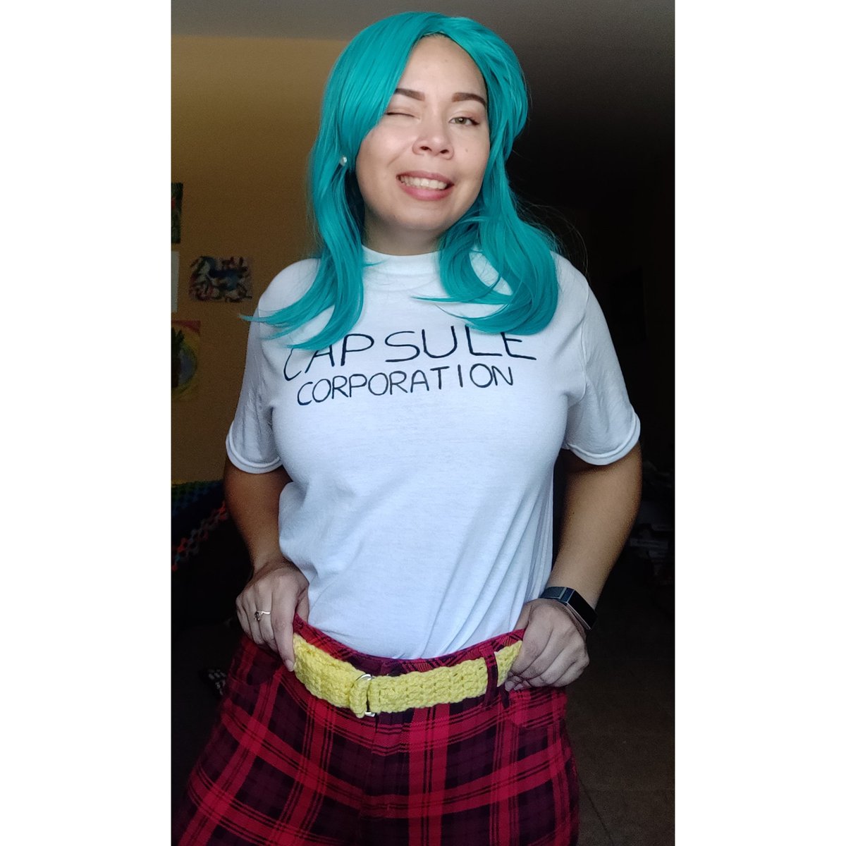 This is my sixth cosplay: Bulma! I painted the shirt and crocheted the belt. Listen, this girl is an anime fashion icon 💖 (I did two versions, of Bulma). #dbzcosplay #cosplay #crochet #bulmacosplay #dbz #bulma
