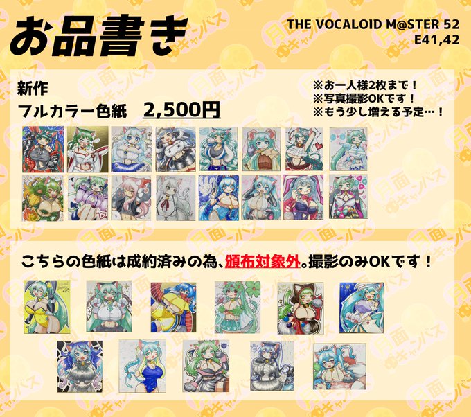 【お知らせ】 ボーマス52 お品書き! 7/23(日)のTHE VOC@LOID M@STER 52 に参加します!! 新作はフルカラー色紙!!たくさん持っていきます!!! 一部、頒布対象外のものがございます!!💦💦 今までの既刊も少し持っていきますので、遊びに来てくださーい!!!✨✨✨ #ボーマス52 #ボーマス
