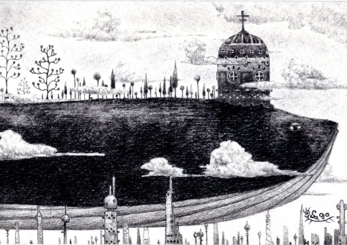 住民増加完成しました! 夕暮れカルピラ・ドルモ。 個展に来てくれた方々が広場に集合。 一緒に綺麗な夕日を見てくれてありがとう。 こちらは3月の共同展示で展示予定です。 #アナログイラスト #鉛筆画 #絵 #イラスト好きさんと繋がりたい #絵描きさんと繋がりたい