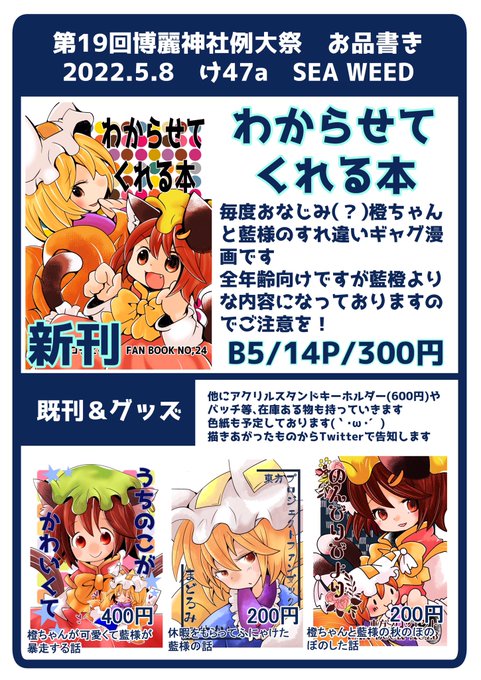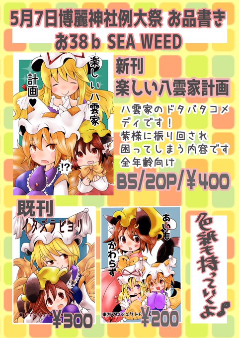 3 2 2023/5/7第20回博麗博麗神社例大祭のお品書き #お品書き #東方 #橙 #八雲家 #藍 #漫画 #妖々夢 #紫 #例大祭 pixiv.net/artworks/10752… 23/04/26 00:08