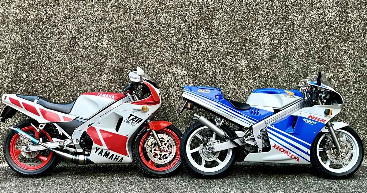 しつこくアオシマ製NSR250Rですけど、ホントにこれで最後にします。久しぶりの完成品で浮かれてます。すみませんです。 以前作ったTZRと共に屋外で撮影。80年代後半にどこででも見ることができた光景を再現してみたかった。 この年代のレーサーレプリカはもっと沢山作りたい! #MotoRacerコンペ